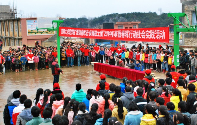 为深入了解寒假春晖行动社会实践开展情况,促进春晖实践活动的更好开展,近日,求是学院党委副书记万平,团委副书记张怀德,文传系行政副系主任张磊,体育系团总支书记俞竞一行在威宁县团委办公室主任马关勋,草海镇团委周书记的陪同下,来到威宁县草海镇东山学校,亲切慰问在这里开展寒假春晖社会实践活动的志愿者们,并向东山学校学生进行了爱心物资捐赠。