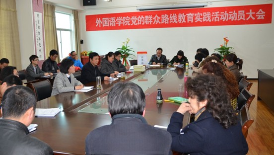 3月14日下午,外国语学院在学院会议室召开党的群众路线教育实践活动动员会,安排部署开展党的群众路线教育实践活动相关工作。学校党的群众路线教育实践活动领导小组综合组副组长、组织部副部长彭洁,组员欧秀松到会指导,学院领导班子成员、教工党员、教师代表、民主党派代表、无党派人士代表及学生党员代表参加动员会。学院党委书记马玉平作动员讲话,彭洁副部长代表校督导组讲话,动员会由刘瑾院长主持。