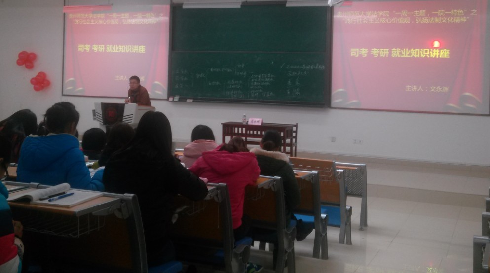 讲座中,文永辉针对同学们的实际情况和实际需要,深入浅出、富有针对性地从三个方面进行讲解。首先对当今法学专业学生的就业情况、司法考试的注意事项以及考研所要做的准备进行了简单的讲述,并从多个方面分析解读了目前贵州省的法治情况以及未来贵州省的法治建设趋势。他指出,就当今法学专业的学生就业情况来看,确实不太乐观。近年来,各高校相继开设法学专业,使进入法学的门槛大大降低,法学专业学生的就业压力大大增加,但存在的问题是,学生的学习质量和司法实务很缺乏,国家也缺乏法律专业人才,所以,最根本的关键在于学生学得精不精;其次,司法考试是一个慢慢积累的过程,不能一蹴而就,他要求同学们从现在开始,备战司考,千万不要有临时抱佛脚的心理;至于考研,更是需要很大的决心和毅力,他强调,在准备考研的过程中,务必要特别地重视英语。