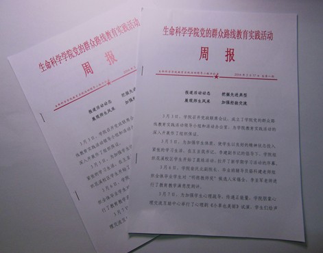 为加强对学院党的群众路线教育实践活动的宣传,促进基层党组织教育实践活动的工作交流,生命科学院专门开办了《党的群众路线教育实践活动周报》。