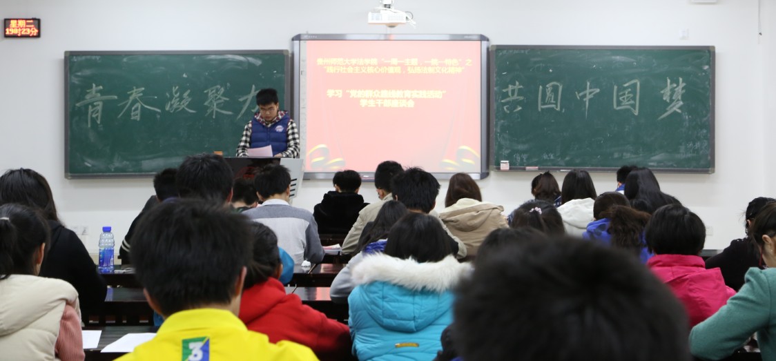 3月18日晚,法学院团委根据群众路线教育实践的要求,结合学院实际,在花溪校区GJ1302教室开展了以“青春凝聚力·共圆中国梦”为主题的党的知识系列学习活动。此次活动是学院开展“一周一主题,一院一特色”和教育实践系列活动之一。参加会议的有院团委、院学生会、院青分会及院新闻编辑社学生干部30余人,会议由团委副书记冉剑锋主持。