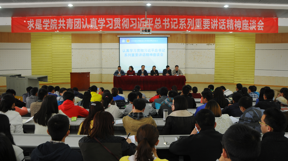 3月28日中午,求是学院在求是报告厅组织开展共青团认真学习贯彻习近平总书记系列重要讲话精神座谈会,对习近平总书记的重要讲话精神进行了传达学习。求是学院党委副书记万平、团委副书记张怀德等相关老师以及各学生组织主要学生干部、各班班长、团支书等参加了学习。