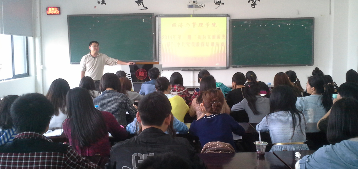 4月16日中午,为深入贯彻落实校、院党委关于开展党的群众路线教育实践活动的精神和学院党建工作的安排,经济与管理学院在花溪校区Gj1202教室开展“2014年第一期‘我为党旗添光彩’中共党员教育培训系列活动”之“践行社会主义核心价值观”讲座。讲座由组织员赵本喜主持。