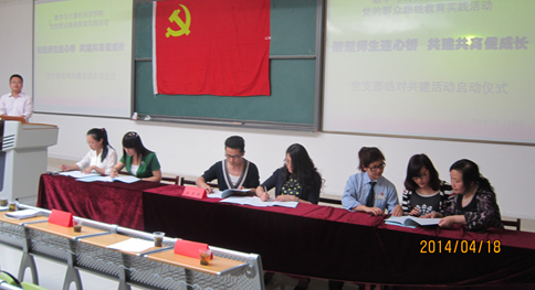 彭洁代表各教工党支部发表讲话,她表示校行政职能部门参与学生支部共建,充分发挥了行政部门的管理育人作用。结对共建只是形式,目的在于使共建对象在思想行动上相互促进、共同进步。要把结对共建作为党的群众路线教育实践活动的有力抓手和载体,朝着十八大提出的学习型、服务型党支部迈进。最后,彭洁代表各与会教工支部表态,会积极主动与所共建学生支部密切联系,扎实行动,取得实效。