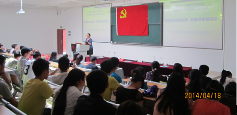4月18日14:00,花溪校区GJ6302教室座无虚席,气氛庄重而热烈,数计学院党的群众路线教育实践系列主题活动 “架起师生连心桥 共建共育促成长“党支部结对共建启动仪式准时举行。作为结对共建教工党支部负责人,组织部副部长兼党校常务副校长彭洁,国资处副处长帅迎,图书馆花溪校区读者服务部主任王惠受邀出席启动仪式。数计学院党委书记戴雪梅,副书记孙谦,院党委组织员杜梅英,各党总支委员及全体学生党员、发展对象、入党积极分子、学生干部共计350余人参加活动。会议由院党委副书记孙谦主持。