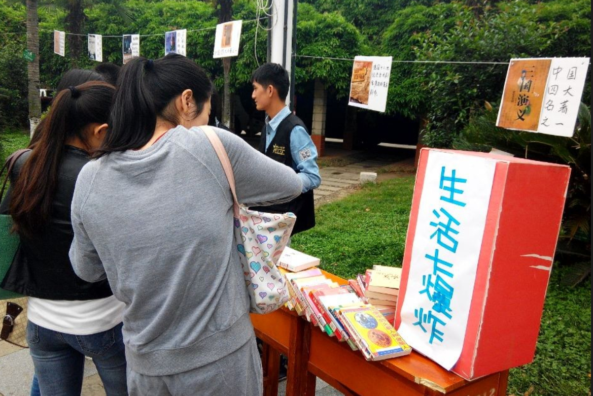 上午10点,“慢阅读”活动在六逸园展开,活动现场摆放了文、史、哲书籍,免费饮用水,为广大阅读图书的同学提供良好的服务,增加了本次读书活动的吸引力,许多过路的同学纷纷驻足,参加到这个活动中来,有效地激发了广大学生阅读的热情。
