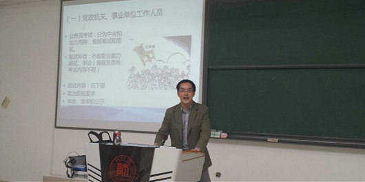 本次讲座由主题发言和现场问答两部分构成。在主题发言中,王育林告诉大家:法学生毕业之后主要会从事公务员、司法机关工作人员、律师、法务人员、金融机构从业人员、军队以及武警等工作,并详细地向同学们讲解了其任职所需的条件和要求。除此之外,他认为法学生也可以选择自主创业、考研、出国留学等其他去向,主要是看自己的目标和对未来的选择。据此,在现阶段他对同学们提出了以下四点要求:一是培养法学生的品质;二是丰富法学生的知识;三是提高法学生的能力;四是发展法学生的各项素质。在讲座过程中,王育林博士对于现下大学生只顾学习课本知识、不注重实际情况和体育锻炼的现状表示了不赞同,他认为“身体是革命的本钱”,结合实际是学习必不可少的方法,他倡导同学们要在课余时间“走下网络、走出宿舍、走向操场”,鼓励大家在努力学习的同时兼顾身体,要学会在实践中学习。