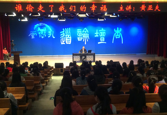 黄亚夫首先开讲的主题为“谁偷走了我们的幸福”,从多角度、多层次、多方面深度剖析了幸福的含义。结合过往古人、当代现实社会的热点关注与典型案例,从社会层面与国际视野出发,立足于实际工作、生活、学业、人际关系等方面,讲述物质满足与精神满足二者的关系及何谓幸福感指数。