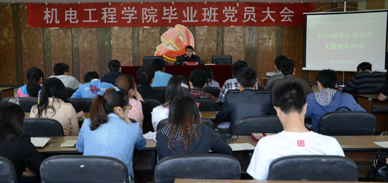 为了使毕业生党员对党的组织管理、组织关系转移手续有一个清晰的认识,加强毕业生党员教育,增强毕业生党员的社会责任感和为人民服务的意识,4月30日下午,机电学院在白云校区综合楼211报告厅召开2014届毕业生党员教育大会,全院80名毕业生党员参加了会议。学习活动由学院党委秘书张文云主讲。