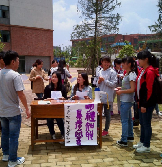 活动以现场答题的方式进行,同学们可以随机抽取题目,答对即可现场领取奖品。由于大家的积极参与,活动现场气氛活跃,氛围较好。大家一边参与活动一边感叹自身国学知识的匮乏,并有很多同学表示以后一定要多接触此类知识,既能充实自己,又能时刻提醒自身注意行为和作风。在活动进行过程中,法学院团委书记欧秀松老师不但对这次活动进行了指导,也为活动人员加油打气,使活动井然有序地进行。