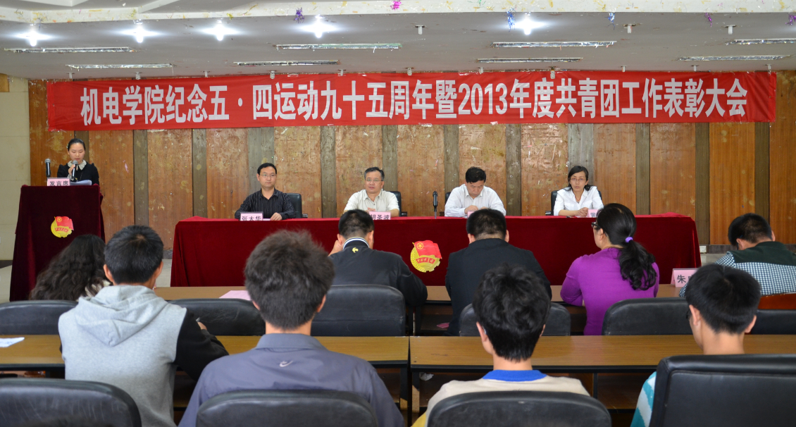 5月13日中午,机械与电气工程学院纪念“五四”运动95周年暨2013年度共青团工作表彰大会在综合楼211室隆重举行,学院党委书记陈椽、院长胡圣波、党委副书记黄平惠、副院长张太华出席大会,白云校区团工委李龙,院党委秘书张文云、团委书记李梅、各年级辅导员以及学生代表200余人参加了大会。会议由辅导员许珊主持会议。