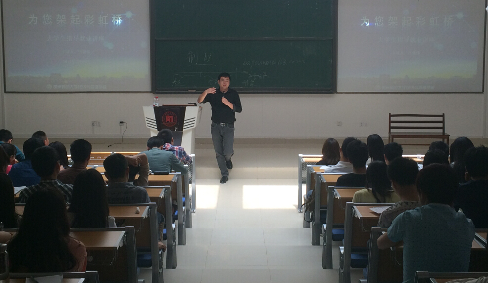 5月20日下午,经济与管理学院在花溪校区GJ6201教室举办了主题为“为您架起彩虹桥”的就业指导讲座,院党委书记巴建伟担任主讲,院团委书记、2011级辅导员张晶晶及2011级电子商务、2011信息管理与信息系统专业所有学生参加讲座。