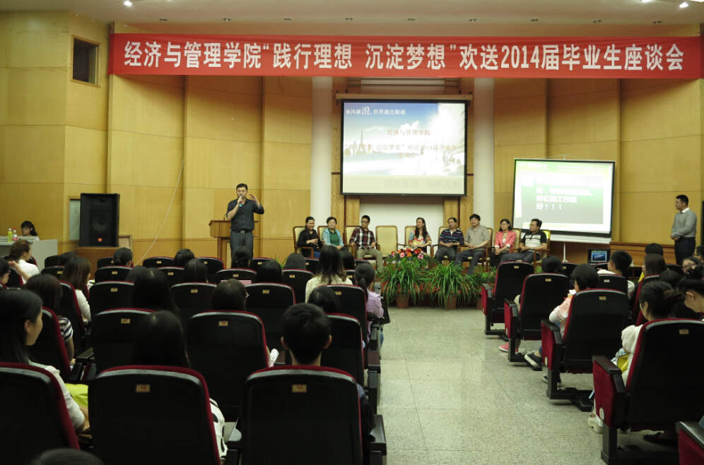 6月10日,经济与管理学院欢送2014届毕业生座谈会在田家炳三楼多功能厅举行,欢送会以“践行理想,沉淀梦想”为主题。院党委书记巴建伟、院长吕萍、院党委副书记项君、副院长王立伟、党委组织员赵本喜、党委秘书江剑虹及院各系老师代表出席,全院共260余名毕业生参加。