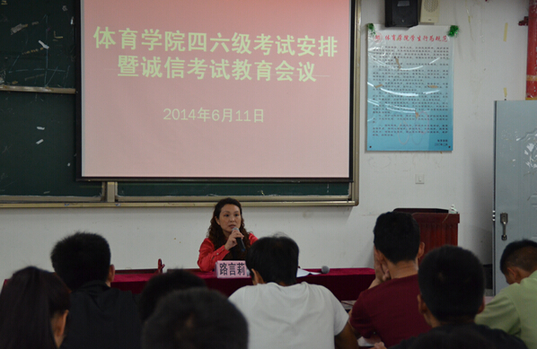 6月11日晚,体育学院党委书记路言莉在综合大楼8—4召开了体育学院四六级考试安排暨诚信考试教育会议。学院参加英语四六级考试的全体同学到场聆听。
