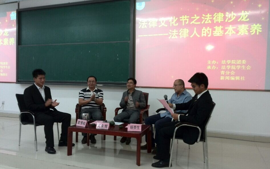 活动伊始,文永辉和杨贵生就主持人提出的问题分别从自己的观点出发,阐述了法律人应该具备的基本素养。文永辉认为,一个从事法律工作的法律人首先必须具备基本的法律思维,清楚地知道权利与义务的关系,其次还要有自己的法律信仰,没有信仰的法律将会退化为僵死的教条。杨贵生则谈到,每个法律人都应该拥有法治理念,它是法治的灵魂,体现了法治的精神实质和价值追求;还要有一颗公正的心,因为公正是法治最普遍的价值表述。接下来,欧秀松针对如何引导法学学子培养法律人素养提出了自己的见解:他希望同学们在学习中培养吃苦精神,加强专业知识框架,多参加实践活动,更要知行合一,经世致用。随后,杨贵生和文永辉还为大家介绍了如何自觉培养优秀素养的一些方法,鼓励同学们在学习专业知识的时候要主动发现问题,解决问题;从一点一滴开始积累,建立一个稳固的知识框架;更要多读一些其他方面的书,提高综合素质,做到知识多元化,技能多元化。在之后的现场提问环节,同学们踊跃地就自己学习中所遇到的困惑、难题向三位老师求教,老师们用幽默风趣的语言,以自身经历为例为同学们讲述、解答,使得大家热情高涨,现场气氛十分活跃。