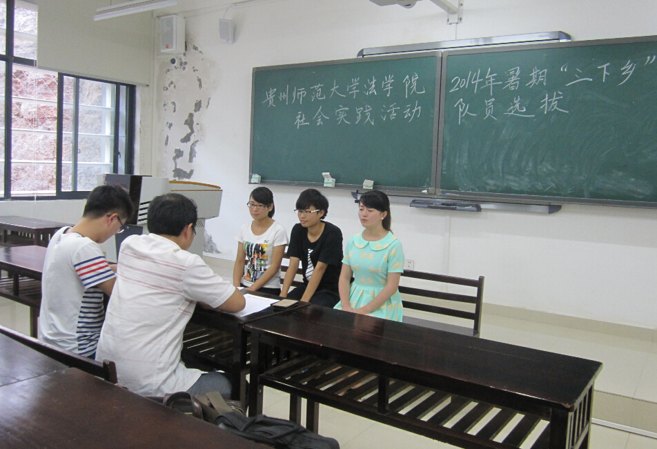6月24日下午,法学院在花溪校区公共教学楼5212和5213教室开展2014年暑期“三下乡”实践活动队员的选拔工作。院团委书记欧秀松、院团委副书记冉剑锋以及上届三下乡带队成员张尚举、熊贤洪担任本次选拔工作的评委。
