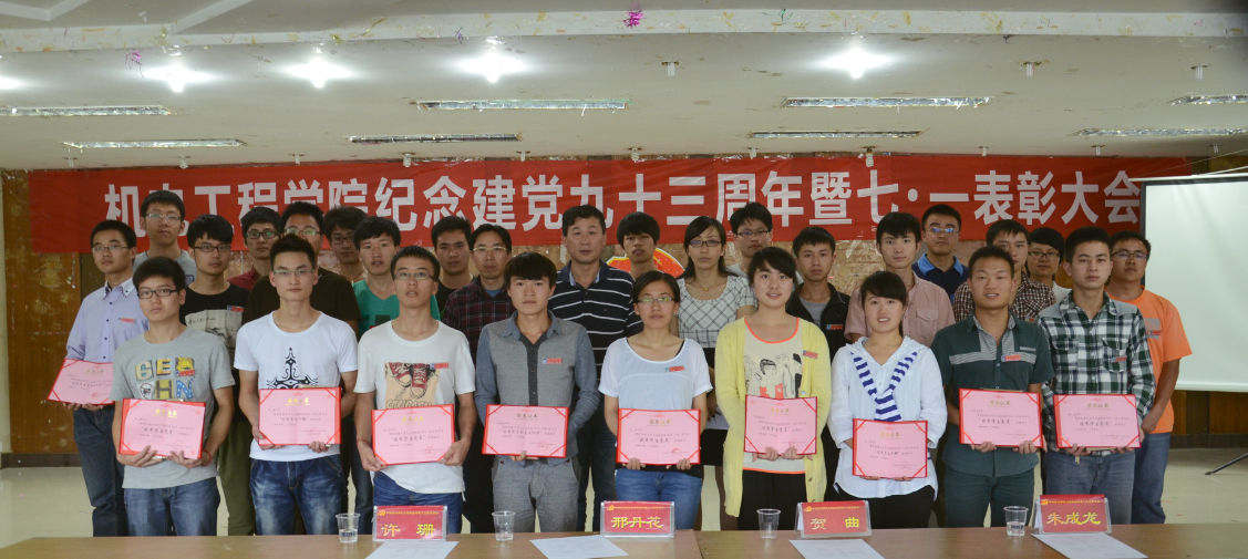 6月27日,机械与电气工程学院在白云校区综合楼211报告厅隆重举行庆祝中国共产党成立93周年暨2014年“七·一”表彰大会。学院党委书记陈椽、副书记黄平惠、副院长郑继明出席大会。辅导员邢丹花、贺曲、朱成龙、许珊及全体学生党员、学生干部共202人参加大会。会议由学院党委秘书张文云主持。