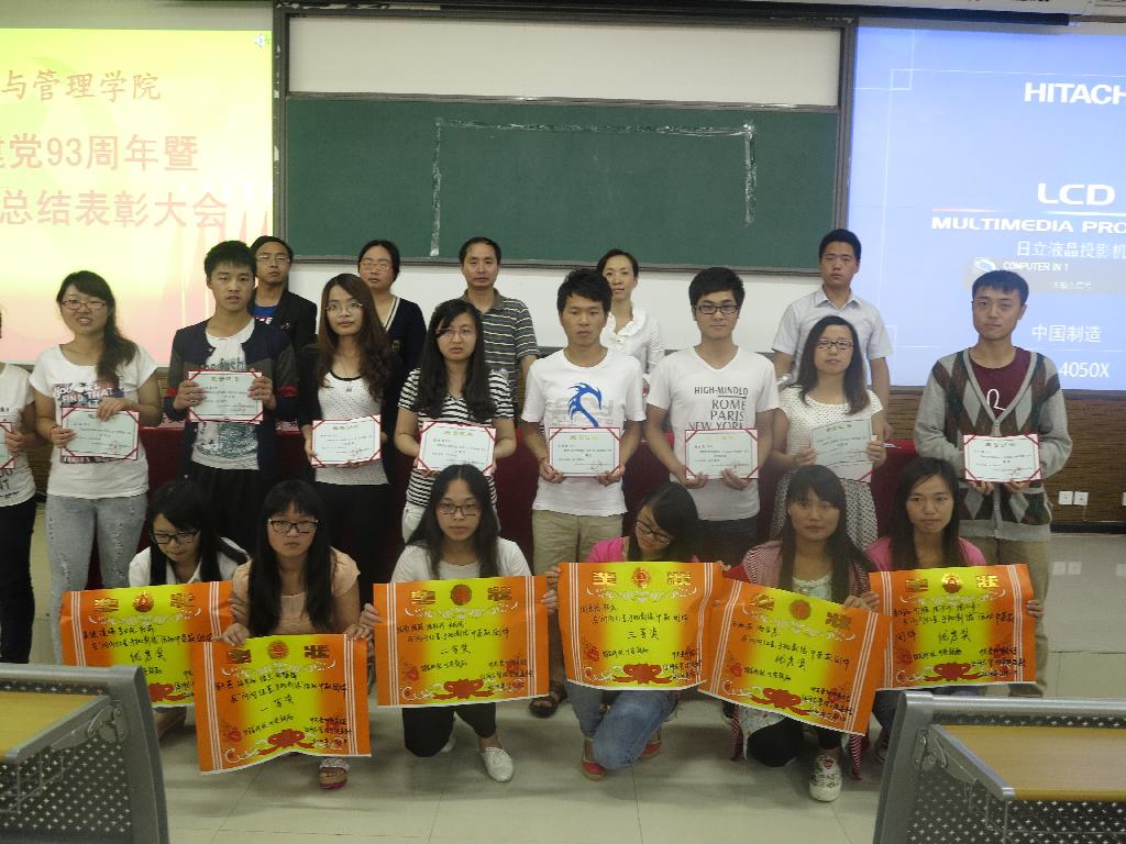 在庄严的义勇军进行曲中,本次大会拉开帷幕。由项君领誓,所有新老党员起立面对党旗庄严的宣读入党誓词。赵本喜宣读了《经济与管理学院党委关于表彰先进集体和优秀个人的决定》,共表彰了优秀党支部1个,优秀双学集体3个,“学生党员形象在公寓”文明寝室16个,优秀共产党员5人,优秀党务工作者8人,优秀双学个人53人,“闪闪的红星”手机影像大赛团队奖6个、个人奖15个,假期读书月优秀奖12人。与会老师为获奖先进集体和先进个人颁奖。