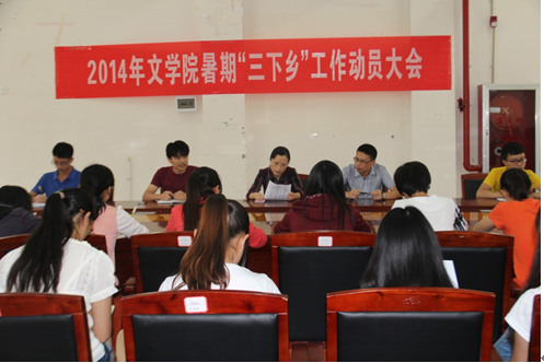 7月2日下午,文学院在花溪校区校团委会议室举行2014年暑期“三下乡”工作动员大会,文学院党委书记黄葵,副书记陈明出席大会,34名参加“三下乡”工作人员全部到场,大会由文学团委副书记杨定主持。
