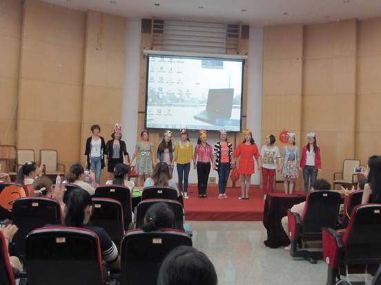 张地容、葛晓穗两位老师以自身丰富的专业知识和教学经验,带领国培学员开展了戏剧工作坊的体验。体验开始,张地容首先讲述了此次体验的目的和意义,而后学员们依次上台表演。他们精心制作了服装和头饰,精彩的节目一个接着一个:《老鼠娶新娘》、《五彩的水果》、《小熊请客》等精彩纷呈,台下不时传来热烈的掌声和欢呼声。