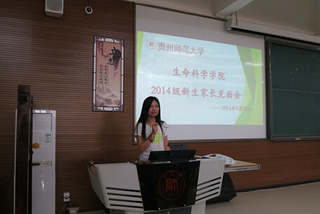 9月28日下午,生命科学学院以“相约金秋,欢聚一堂,携手奋进,共创辉煌”为题的2014级新生家长见面会在花溪校区GJ6201教室举行,学院2014级辅导员余阳主持会议。