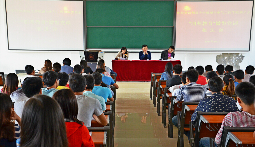 10月10日下午,机械与电气工程学院学生党总支在机电楼8501阶梯教室召开了“朋辈教育”微型党课主题创新活动推进会。我院“朋辈教育”微型党课自2013年举办以来,先后获得上级组织部门和师生党员的一致好评,今年7月获批为贵州师范大学2014年度基层党建创新活动重点项目。为更好地推进活动开展,学院党委书记陈椽亲临现场指导,学院党委副书记、学生党总支书记黄平惠作指导讲话。会议由学生党总支副书记张文云主持。