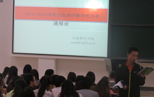 10月11日下午,生命科学学院2013-2014学年评优评奖通报会在理综实验楼一楼举行,2013级全体学生参加了此次大会,会议由辅导员刘学鑫老师主持。此次会议的重点是让学生了解综合测评实施的依据以及评优评奖工作的流程。