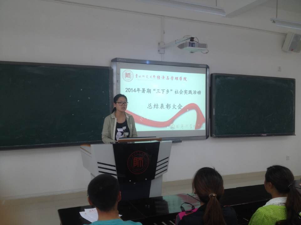 10月14日中午,经济与管理学院在花溪校区GJ1506教室召开暑期“三下乡”社会实践活动总结大会暨表彰大会。院团委书记张晶晶,带队教师向凯麟、李庆出席。全体三下乡队员以及2014级的全体班委参加。会议由志愿服务队队员张晟男主持。