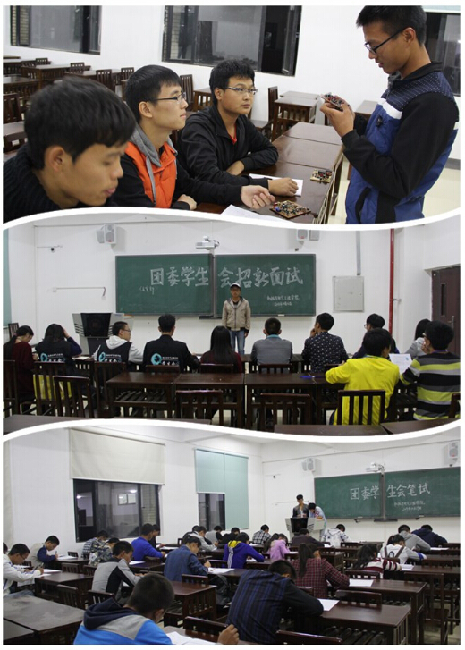 面试者需要进行简短的自我介绍,表达自己对应试部门的认识、进入部门后的工作规划、个人性格、优缺点等。整个面试过程或紧张,或放松,不尽相同。青分会科技部应试同学对科技的热情、文艺部面试时传来的歌声都代表了我院学子的多才多艺;宣传部书画爱好者的创意预示了我院宣传展板上的别样风采。在此基础上,团委、学生会于19日晚进行了笔试,根据面试、笔试表现,最终筛选出2014届团委、学生会、青分会干事成员。