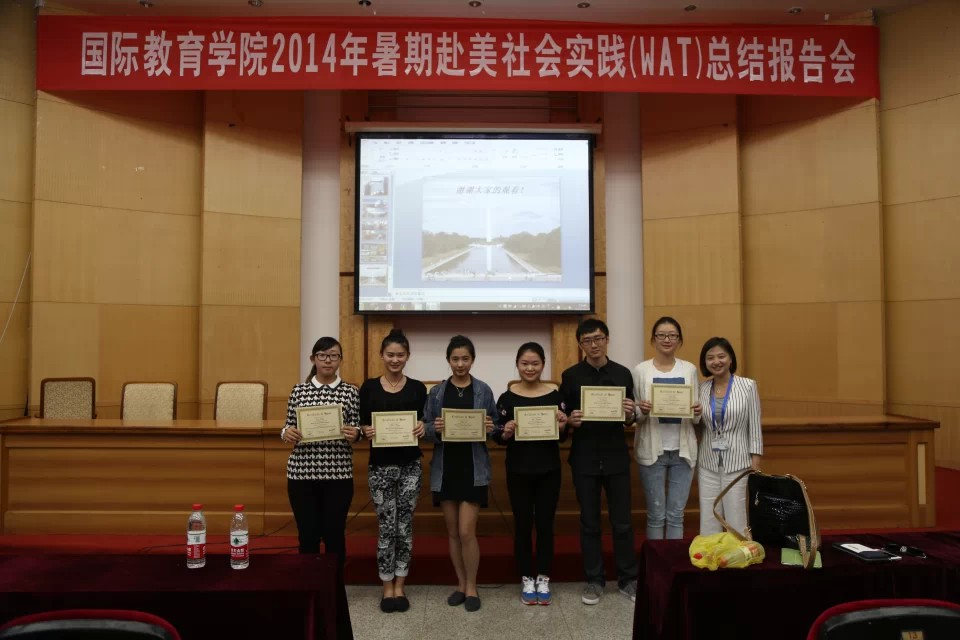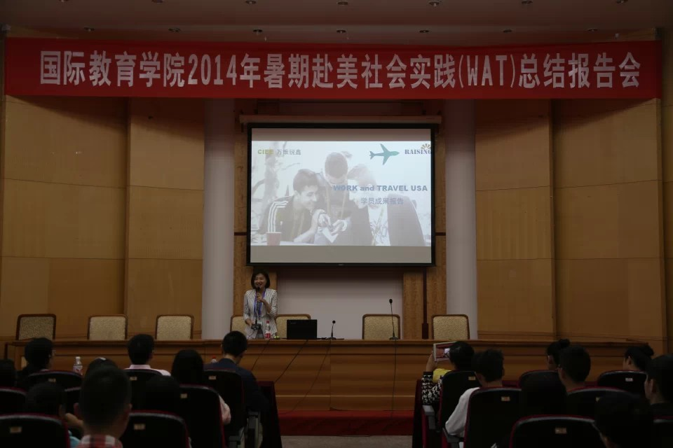 0月10日中午,国际教育学院在田家炳三楼多功能厅召开了2014年暑期赴美社会实践(WAT)总结报告会。国际教育学院院长习晓明,主管学生工作的汪莉栋老师,美国CIEE在华代表及全体师生参加。
