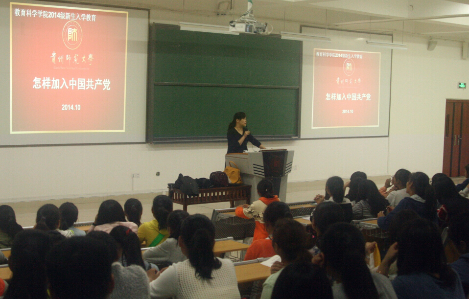 10月20日,教育科学学院于花溪校区GJ6302教室开展“2014级新生入学教育”系列讲座。讲座分别邀请了学院党委组织员吴嘉佳、团委书记高阳担任主讲嘉宾。14级辅导员郭腾飞、邵征峰及2014级全体新生共计340余人参加了讲座。