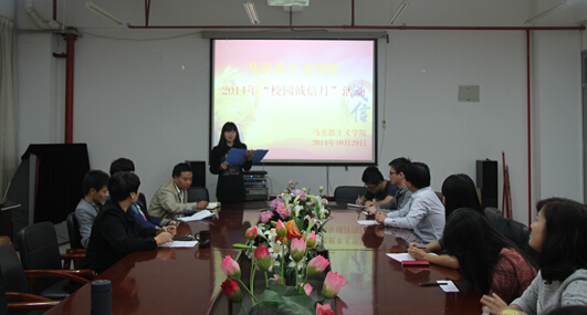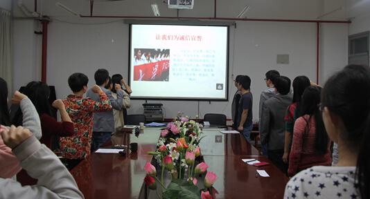 为了进一步提高学生的诚信意识,营造诚实守信的良好氛围,马克思主义学院全体同学及学院领导于10月29日晚在学院会议室举行“校园诚信月”主题活动。