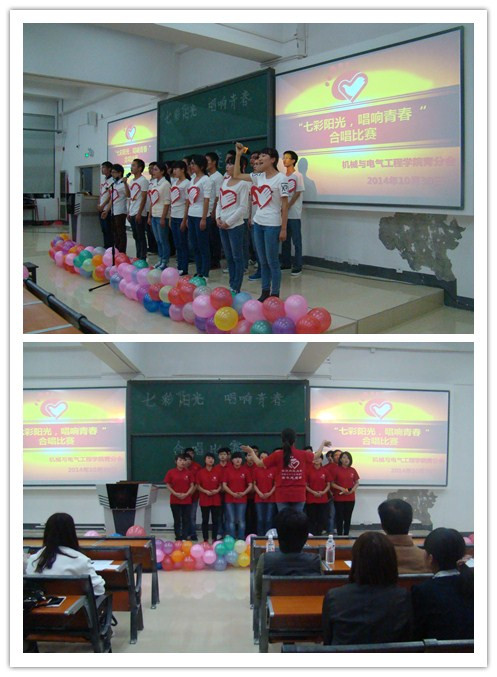为加强志愿者之间的交流,展示志愿者的蓬勃朝气,10月30日晚,机械与电气工程学院“七彩阳光·唱响青春”志愿之歌合唱比赛在机电大楼8501教室隆重举行。校青联指导老师邵云贺,学院团委副书记许珊、电气系老师罗云出席比赛并担任评委,同时邀请了校青联主席郑维艳、副主席周倩、杜雨鑫,职业技术学院青分会会长万兵共襄盛会。