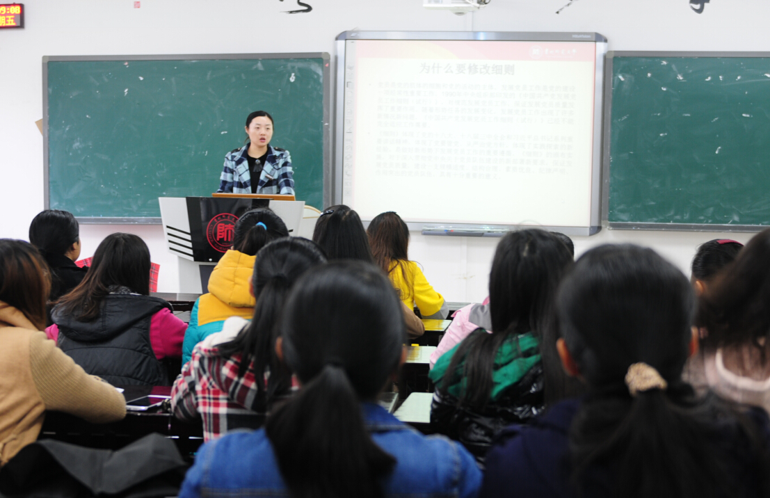 在培训会上,苗庆首先为大家介绍了2014年6月新修改的《中国共产党发展党员工作细则》,就修改原因、修改内容、修改后特点等进行说明。接着带领大家全文学习了《细则》的内容,一边学习一边对《细则》进行分析解读。最后还对实际工作的程序步骤、材料的填写做出指导,就大家日常工作中遇到的问题和情况进行了分析解答,对工作的规范开展提出了要求,还与同学们进行了交流讨论。