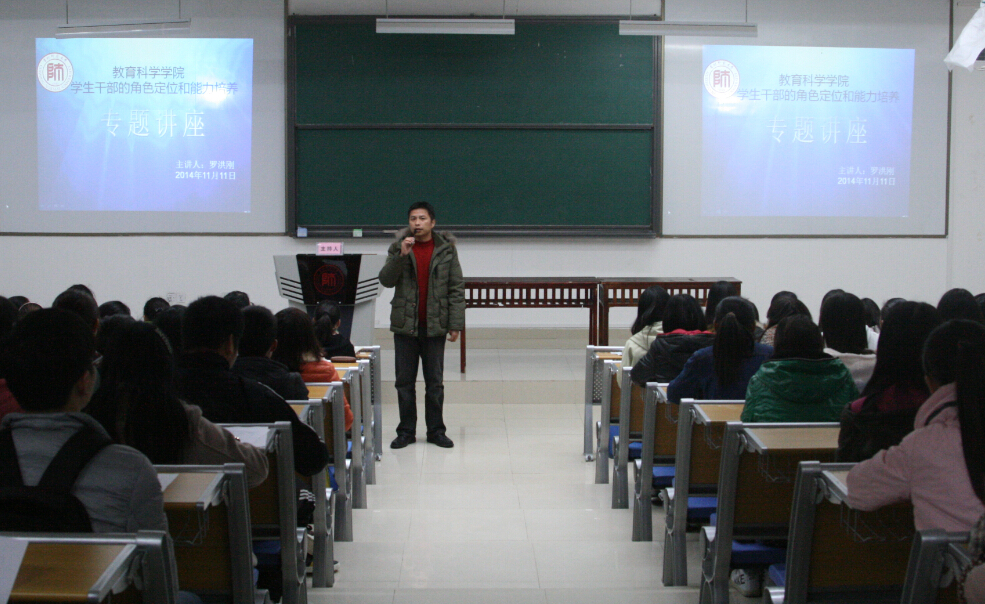 11月11日,教育科学学院于花溪校区GJ6301教室开展2014—2015学年“青年马克思主义者培养工程”学生骨干培训系列专题讲座第一讲之“学生干部的角色定位和能力培养”。此次讲座由院党委副书记罗洪刚担任主讲嘉宾,学生会、青分会全体成员、各级各班班委共计270余人到场聆听。讲座由院团委书记高阳主持。