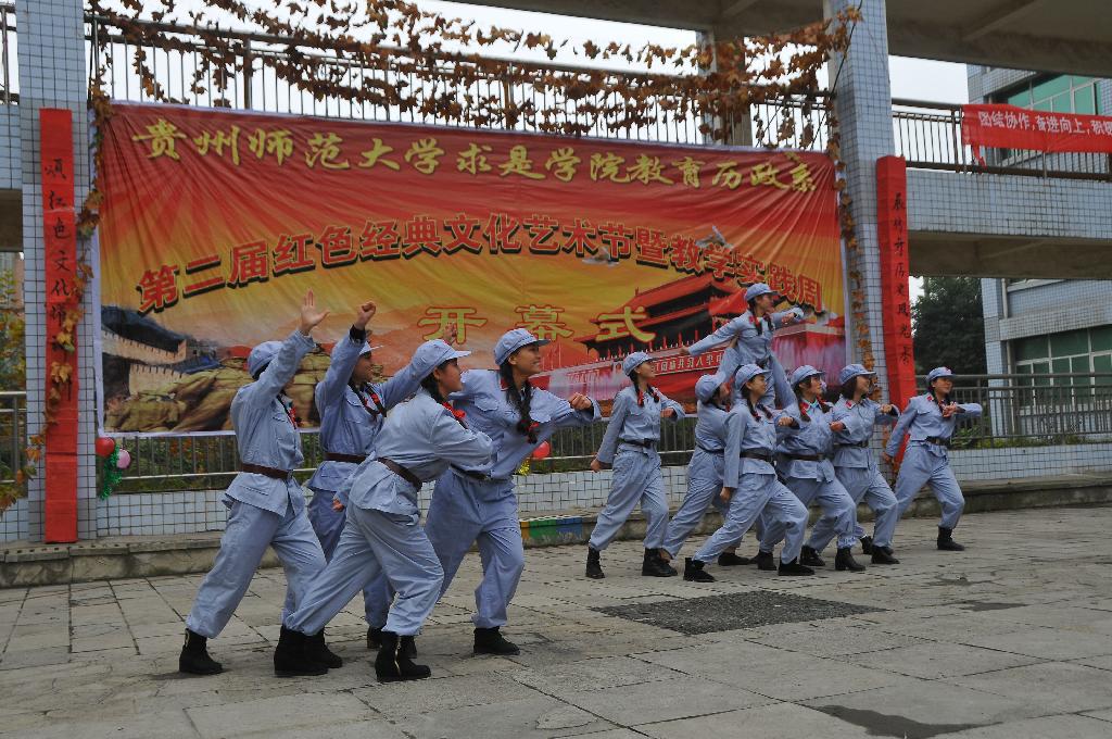 广场极具特色的梧桐落叶装饰,使整个会场笼罩着浓浓的古朴的气息,103名身着红军服的2013级思政班学生活跃在会场的每一个角落,为参观的师生介绍红色历史文化。活动现场还设置了知识问答区,广大师生在参观的同时还可以参与知识问答铭记历史事件。