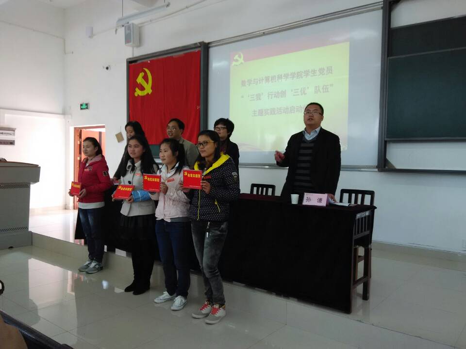 11月30日,数学与计算机科学学院学生党员“见‘三我’行动创‘三优’队伍”主题实践活动启动仪式在花溪校区GJ6402教室举行。校党委组织员、机关党委书记罗税,数计学院党委书记戴雪梅,党委组织员、学生党总支书记杜梅英出席。数计学院学生党总支委员及全体学生党员、预备党员、部分入党积极分子参加。动由学院党委副书记孙谦主持。