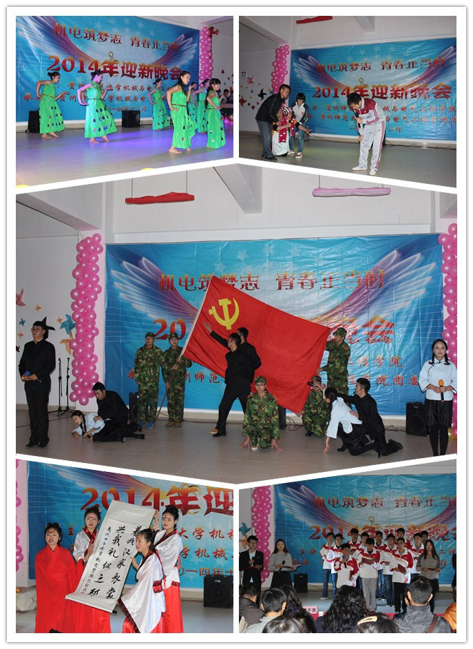 12月10日晚,机械与电气工程学院“机电筑梦志·青春正当时”2014年迎新晚会在花溪校区二食堂五楼隆重举行。本次晚会得到学院领导的高度重视和各兄弟学院的大力支持,学院党委书记陈椽,院长胡圣波,党委副书记黄平惠,副院长郑继明,党委秘书张文云,团委副书记许珊,各年级辅导员、学院办公室、机械系、电气系老师,学工部杨光复以及各兄弟学院老师和学生会的代表,与现场350余名观众共同观看了本次晚会。晚会由雷路、杨椰玲、吴圣敏、刘俐利主持。