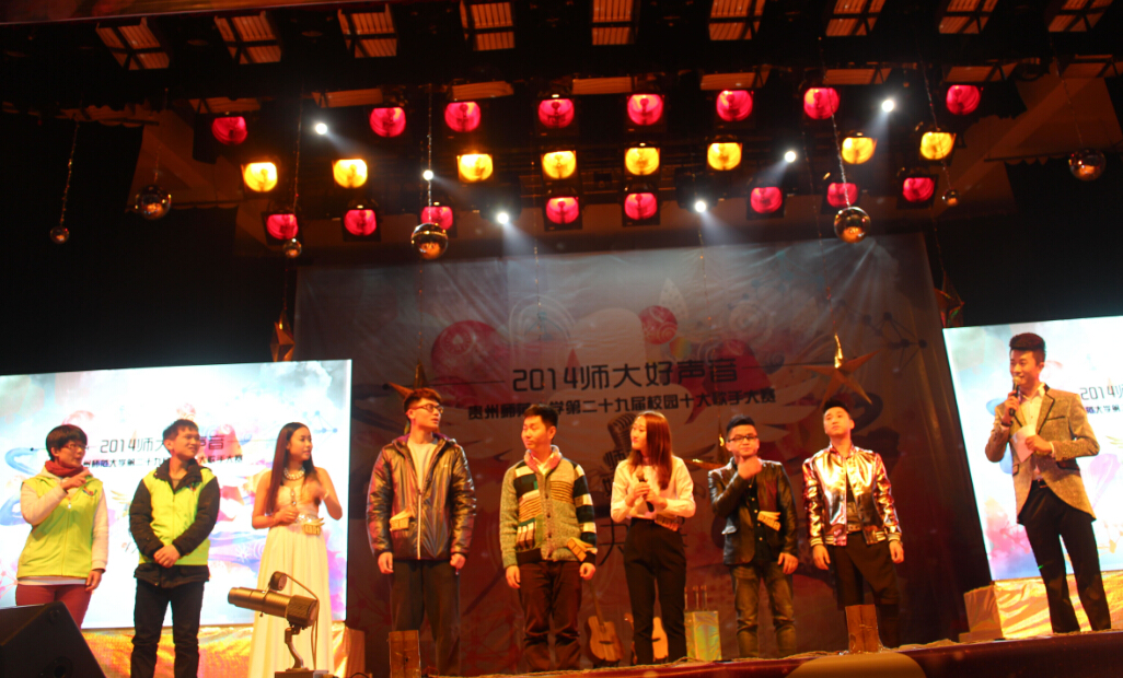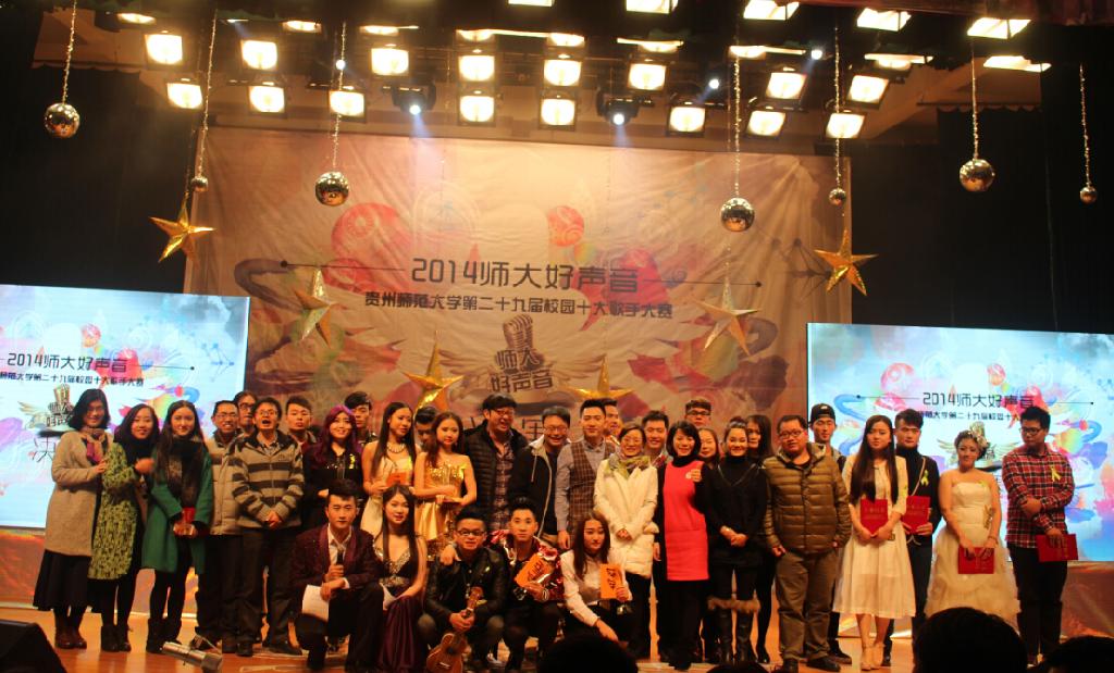12月9日晚,由校团委主办,校学生会承办的“2014年师大好声音——贵州师范大学第二十九届校园十大歌手”总决赛在宝山校区大礼堂成功举行。担任本次总决赛的评委有贵州省大型民族歌舞晚会“多彩贵州风”主演郑涵月,贵州师范大学音乐学院声乐副教授张涛,贵州师范大学音乐学院教师张景波、张鹭、廖澜,中国华谊兄弟音乐公司签约歌手王艺,中国麦田计划贵阳团队负责人涓涓,以及由学生代表组成的共20位大众评审。校党委宣传部副部长周成海,校团委副书记姚作舟与现场近两千名师生共同观看比赛。