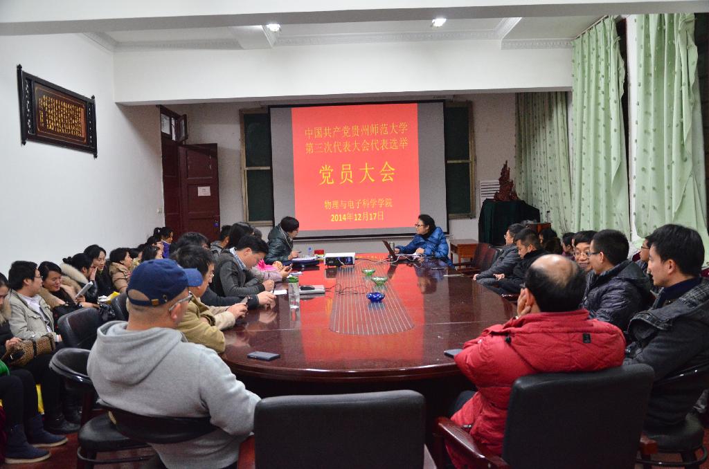 为迎接中国共产党贵州师范大学第三次代表大会的胜利召开,物理与电子科学学院于12月17日,在宝山校区学院会议室召开了党员大会,选举产生了出席学校第三次党代会的代表。全院教职工党员参加了会议。会议由学院党委书记宇燕主持。