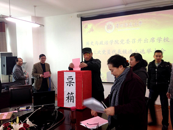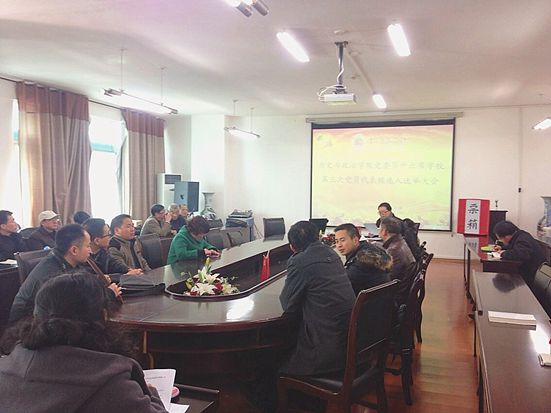 12月19日下午,历史与政治学院党委在学院会议室召开了学校第三次党代会代表选举大会。学校第三次党员代表大会筹备工作组张瑜到会指导工作。学院全体教师党员参加。会议由院党委书记杨芳主持。
