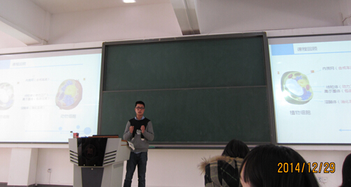 经过前期的认真准备,14位学生代表依次通过PPT分别从“说教材、说教法、说过程、说观点、说实例、说作用”几个方向对教材中“细胞核控制细胞的遗传和代谢功能”及“细胞核的结构”进行全面分析,对教学重难点进行深入讲解,对教学板书进行丰富设计。通过课堂演练,让以教师身份授课的学生阐述自己的教学意图,梳理自己处理教材的方法,从而使“说课”的主题更明确,重点更突出。