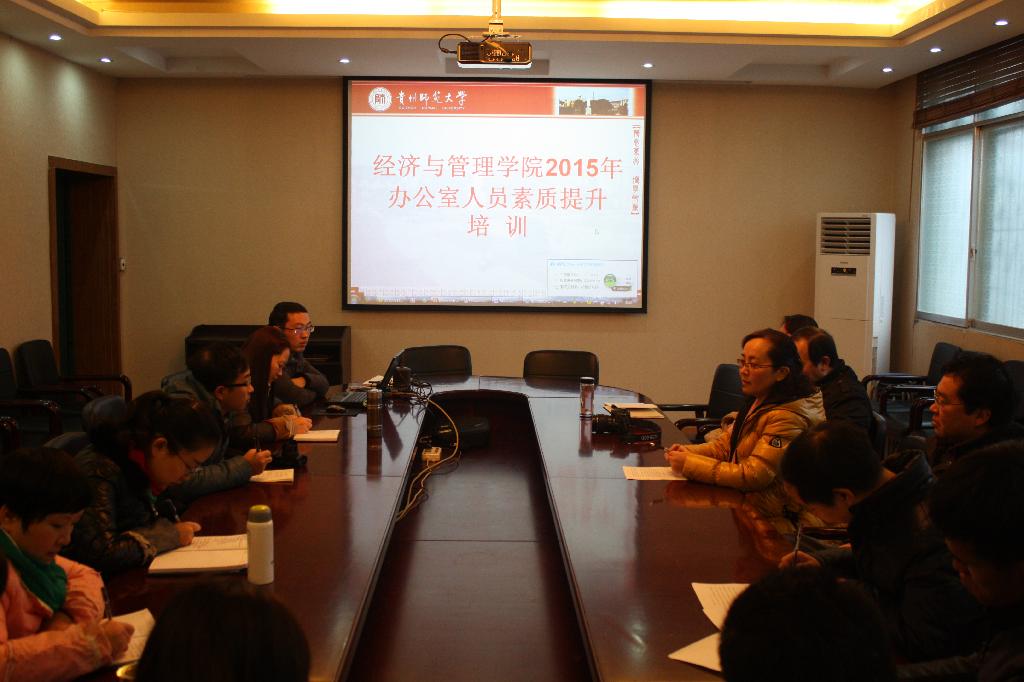 在学生们正在进行紧张的期末考试之际,经济与管理学院党政办公室的教师们也迎来了一场特殊的培训和考试,1月13日,为全面强化办公室人员的工作能力、提升综合素质、优化服务意识,经济与管理学院在宝山校区会议室开展了2015年办公室人员素质提升培训。学院党政领导出席培训会,学院党政办公室所有成员参加培训。培训会由院党委组织员赵本喜主持。