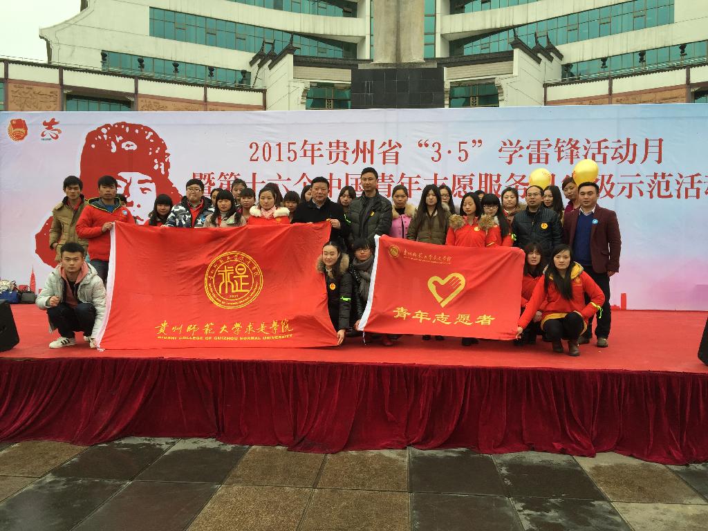 3月5日,由省文明办、团省委、省志愿服务联合会等部门举办的2015年贵州省“3.5”学雷锋志愿服务省级示范活动在筑城广场举行,团省委书记涂妍,省文明办专职副主任、省志愿服务联合会副会长朱文东、省志愿者行动指导中心主任邓守成等领导出席活动,求是学院团委副书记张怀德带领50名志愿者参加了活动并在现场提供志愿服务。