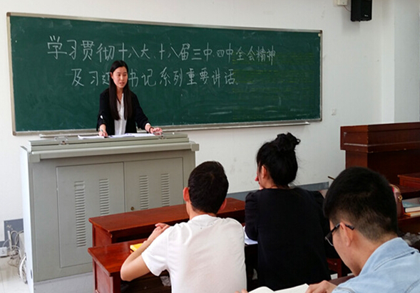 讨论会上,支部党员围绕十八届四中全会精神、习近平总书记的系列重要讲话展开了认真的学习和讨论。支部书记戴欣同学宣讲了十八届四中全会的会议公报,她倡导支部党员和入党积极分子,十八届四中全会精神内涵丰富,作为学生党员,应该通过学习讨论,深刻领会会议精神,把握实质指导实践。习总书记重要讲话是我们做好改革发展稳定工作的思想灯塔和行动指南。要把学习领会习总书记重要讲话与自己的专业学习实践有机结合起来。