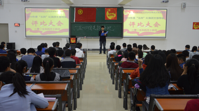 为进一步加强共青团基层组织建设,4月14日19:00,机械与电气工程学院在机电楼8501教室召开2014年度“五四红旗团支部”评选大会。学院团委副书记许珊、2014级机械班辅导员廖文群,职业技术学院团委书记柳青、经济与管理学院辅导员向凯麟担任评委,院属各班300余名学生代表现场观看了评选汇报。