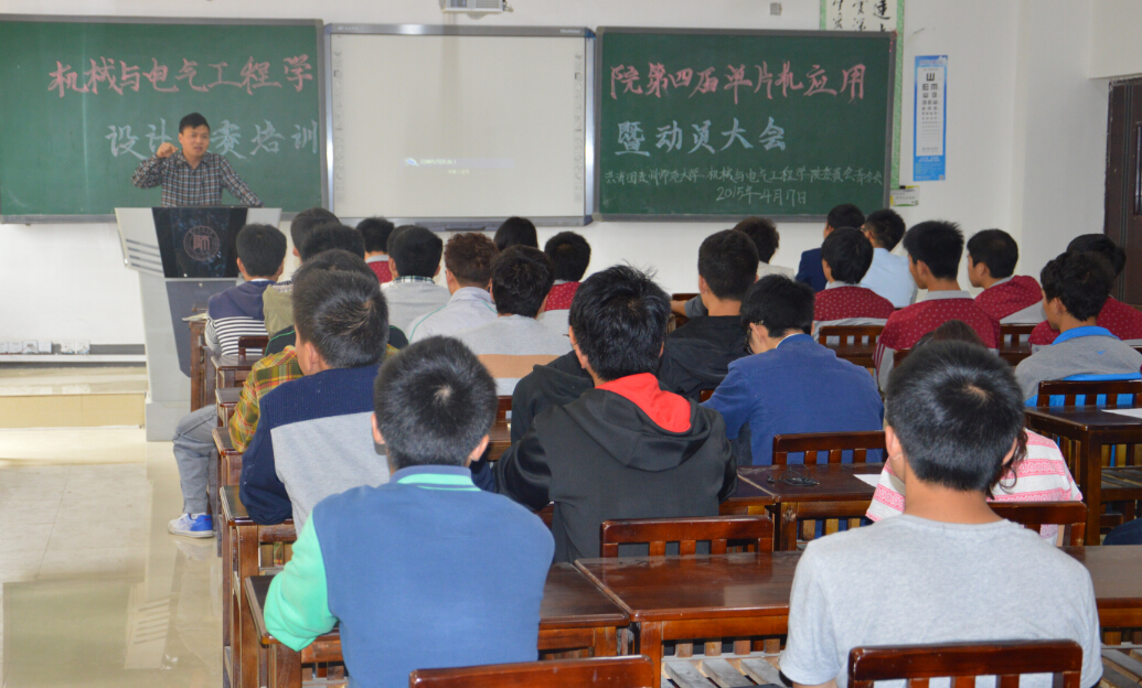 4月17日,机械与电气工程第四届单片机应用设计大赛专题培训暨动员大会在机电楼8209教室举行。学院实训中心主任郑宇担任主讲,青分会科技部全体成员和80余名参赛学生参加培训会。