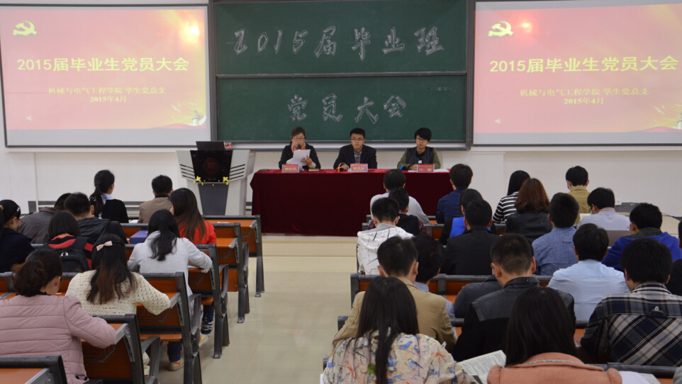 为了使毕业生党员更好对党的组织管理、组织关系转移手续有一个清晰的认识,加强毕业生党员教育,增强毕业生党员的社会责任感和为人民服务的意识,4月27日下午,机电学院在学院楼8501报告厅召开2015届毕业生党员教育大会,学院党委秘书张文云,学生党支部书记邢丹花、许珊出席会议,2015届的102名毕业生党员参加了会议。会议由许珊主持。