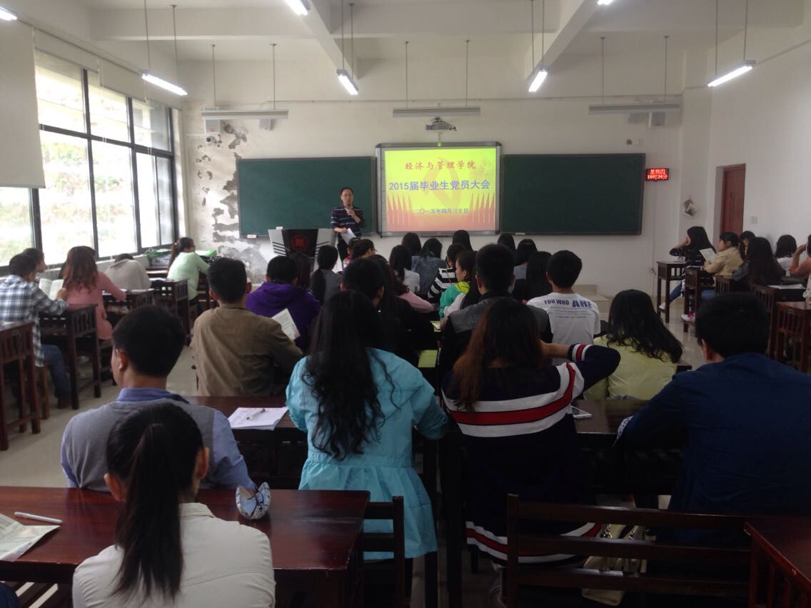 4月30日,经济与管理学院在GJ5213召开了2015届毕业生党员会议。学院党委副书记项君,组织员赵本喜出席本次会议,毕业生党员60余人参加了此次会议,会议由2011级辅导员张晶晶主持。