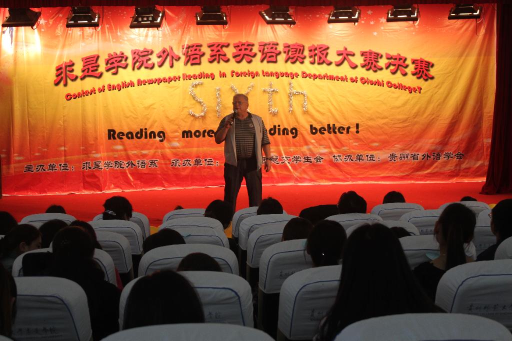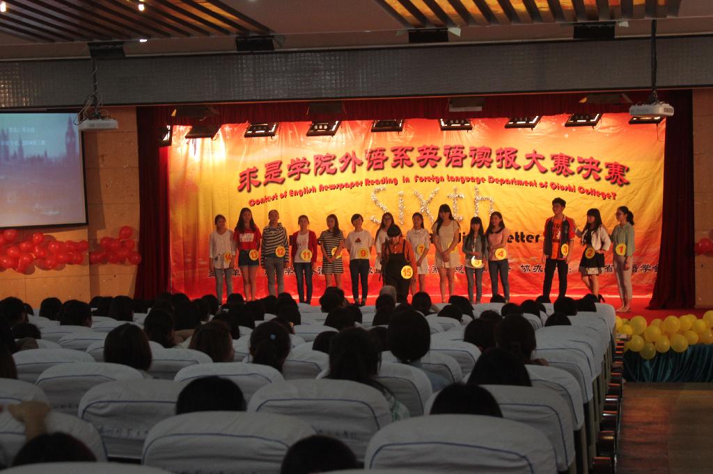 5月8日下午,求是学院外语系第六届英语读报大赛在求是讲堂举行。经过初赛、复赛层层选拔,15名同学脱颖而出参加了此次决赛。学院外语系教学系主任冒国安、行政系主任王晓梅、听力学科组长桂锐林,泛读学科组长张利萍及外语系口语任课教师Jack等五位老师担任比赛评委。